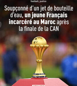 MondeSécuritéSport Finale de la CAN : initialement présenté comme un « supporter algérien », Lyèce Mouri, un Français, est soupçonné d’un jet de bouteille sur la sécurité lors du match entre le Maroc et le Sénégal, condamné à 3 mois de prison ferme au Maroc MondeSécuritéSport Finale de la CAN : initialement présenté comme un « supporter algérien », Lyèce Mouri, un Français, est soupçonné d’un jet de bouteille sur la sécurité lors du match entre le Maroc et le Sénégal, condamné à 3 mois de prison ferme au Maroc