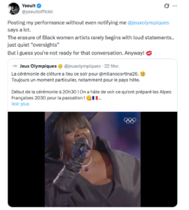 CultureSport « Un effacement des artistes noires » : alors que le compte X des JO met en avant la performance d’Yseult lors la clôture des Jeux olympiques d’été de 2024, l’artiste déplore que son nom ne soit pas mentionné CultureSport « Un effacement des artistes noires » : alors que le compte X des JO met en avant la performance d’Yseult lors la clôture des Jeux olympiques d’été de 2024, l’artiste déplore que son nom ne soit pas mentionné