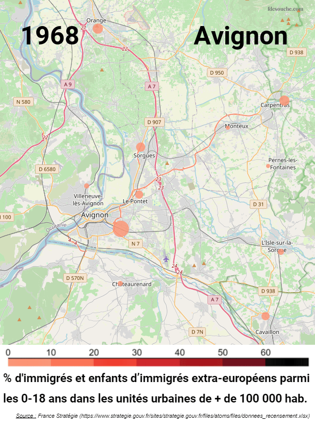 - la couleur du cercle indique le taux d’individus de la catégorie représentée dans la commune. Par exemple, le taux d’immigrés et enfants d’immigrés extra-européens parmi les 0-18 ans.