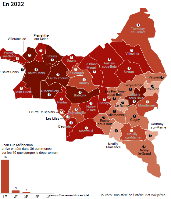 En Seine-Saint-Denis, il a toujours été au-dessus de sa moyenne nationale, avec16,99 % en 2012, 34,02 % en 2017 et 49,09 % en 2022 ; mais avec des progressions nettement plus fortes qu’à l’échelle nationale (17,03 et 15,07 points). Mélenchon a progressé le plus là où il était déjà le plus haut. En dix ans, il a ainsi gagné plus de40 points dans neuf communes: Clichy-sous-Bois (46 pts), Villetaneuse, La Courneuve, Épinay-sur-Seine, Stains, L’île-Saint-Denis, Dugny, Bobigny et Pierrefitte-sur-Seine.