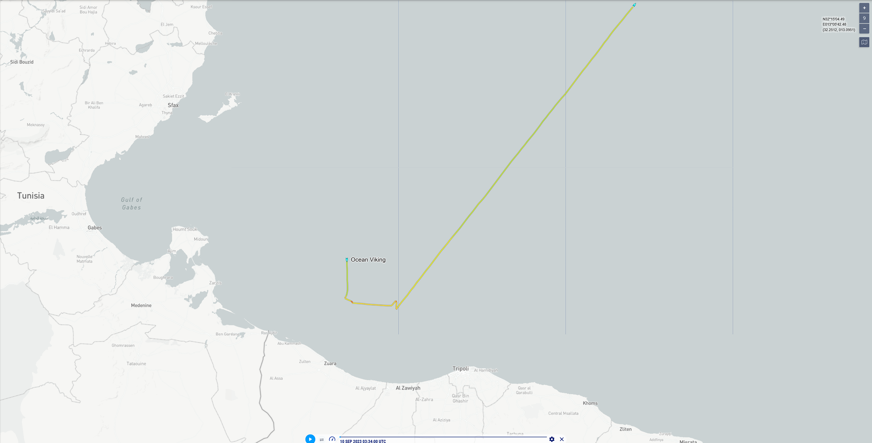 Trajet de l’Ocean Viking au large des côtes libyennes :