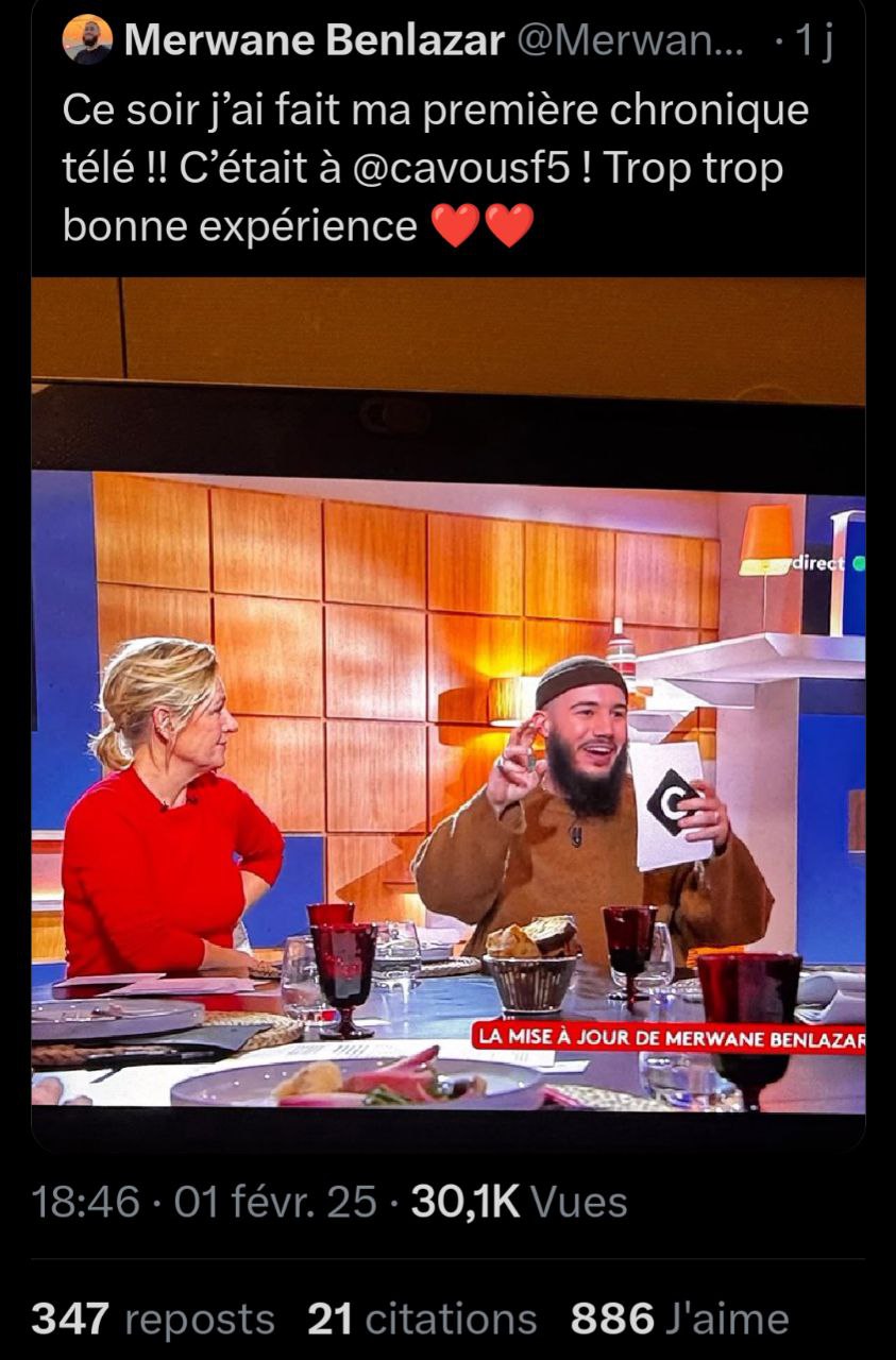 “Une trop bonne expérience” et quelques émojis en forme de cœur rouges à la sortie du plateau de C à Vous. Dans un tweet rapidement supprimé, l’humoriste Merwane Benlazar pensait célébrer sa première apparition à la télévision, dans l’émission animée par Anne-Elisabeth Lemoine sur France 5.