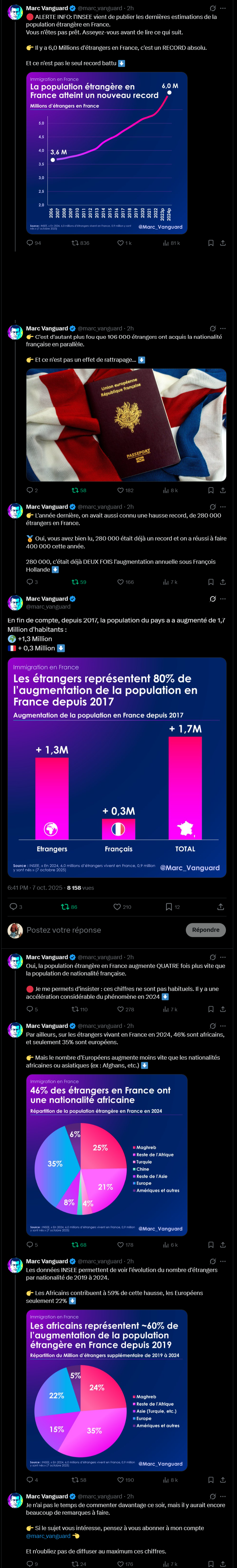 L’analyste Marc Vanguard souligne une nouvelle explosion migratoire : « L’année dernière, on avait aussi connu une hausse record, de 280 000 étrangers en France… et on a réussi à faire 400 000 cette année. » Selon lui, le pays aurait gagné 1,7 million d’habitants depuis 2017, dont 1,3 million d’origine étrangère. Il note : « Oui, la population étrangère en France augmente QUATRE fois plus vite que la population de nationalité française. »