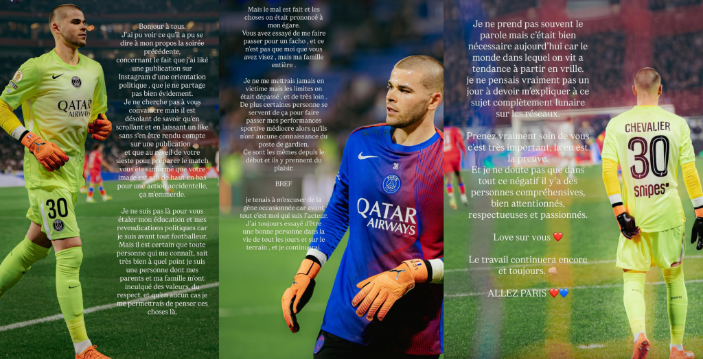 Le gardien parisien, recruté cet été pour 40 millions d’euros en provenance de Lille, s’est retrouvé au cœur d’une controverse politique inattendue. Ce dimanche novembre, des captures d’écran ont révélé qu’il avait liké un post Instagram lié au Rassemblement National. Le post en question, publié par le compte “spittinfakt”, met en scène Julien Aubert, représentant des Républicains, affirmant qu’il voterait RN plutôt que Nouveau Front Populaire. La description du post indique : “Ce représentant LR n’a pas dissimulé son soutien fervent au RN, laissant de marbre ce plateau infecté de gauchistes.” Chevalier a retiré son like après la diffusion des captures d’écran. Mais les réseaux sociaux s’étaient déjà enflammés. (…)