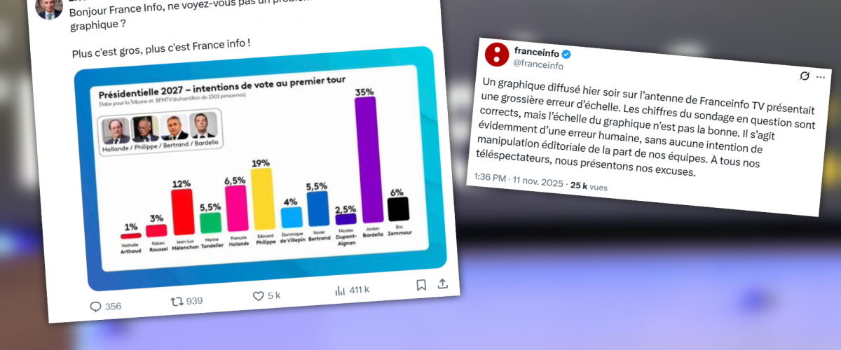 « Un graphique diffusé hier soir sur l’antenne de Franceinfo TV présentait une grossière erreur d’échelle. Les chiffres du sondage en question sont corrects, mais l’échelle du graphique n’est pas la bonne. Il s’agit évidemment d’une erreur humaine, sans aucune intention de manipulation éditoriale de la part de nos équipes. À tous nos téléspectateurs, nous présentons nos excuses. »