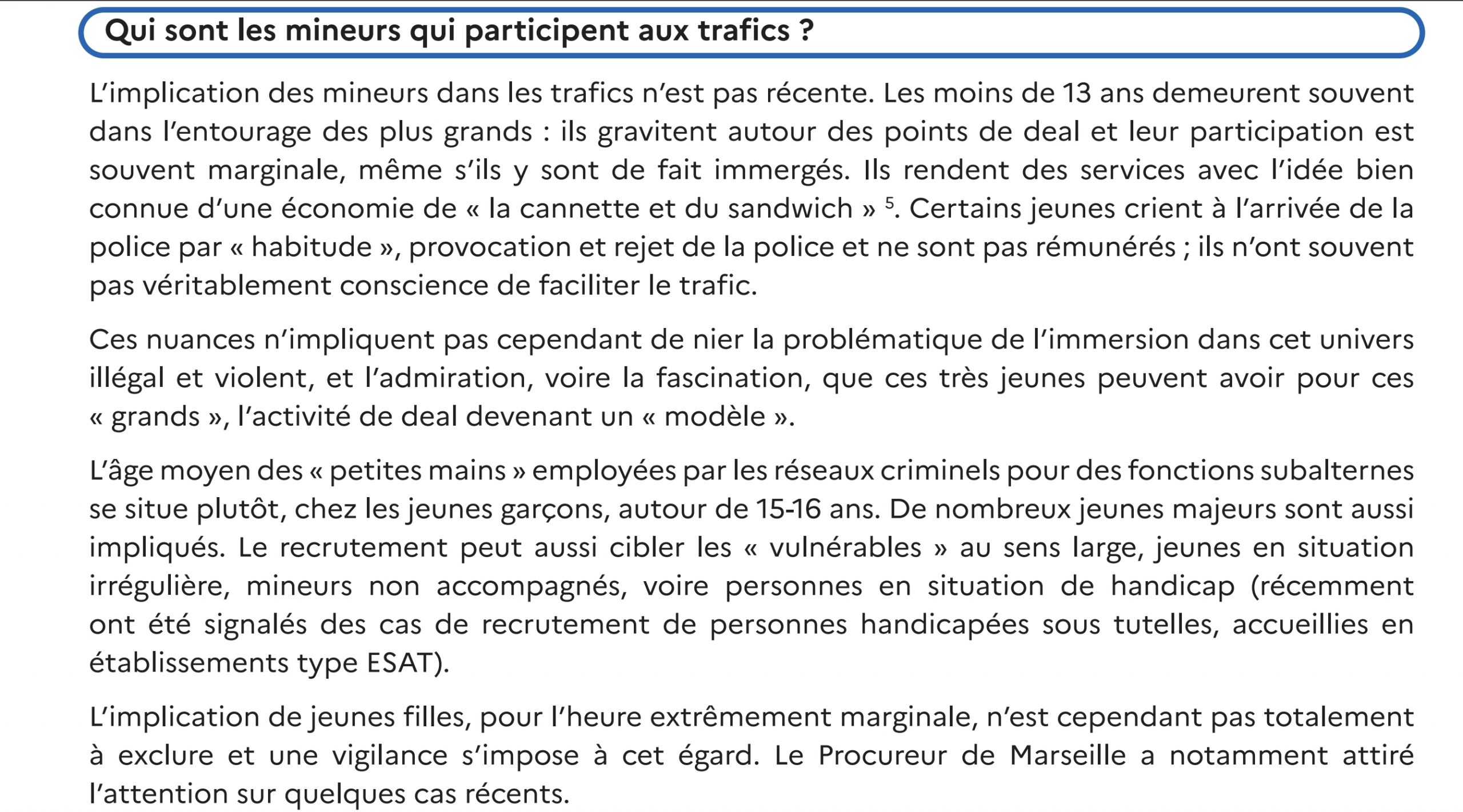 Selon les chiffres de la Mission interministérielle de lutte contre les drogues et les conduites addictives (Mildeca), en 2024, l’âge moyen des « petites mains » employées par les réseaux criminels se situe autour de 15-16 ans avec un recours accru à de très jeunes mineurs, parfois âgés de dix ans. « Le phénomène est en augmentation, il est de plus en plus violent et il y a de plus en plus de jeunes, notamment avec le mode de recrutement sur les réseaux sociaux » (Gouvernement)