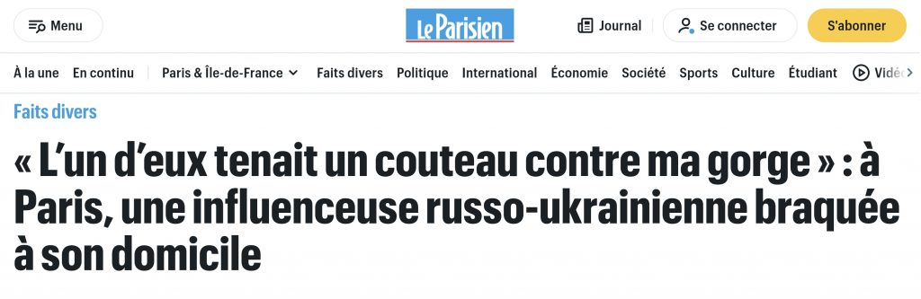 https://www.leparisien.fr/faits-divers/lun-deux-tenait-un-couteau-contre-ma-gorge-a-paris-une-influenceuse-russo-urkrainienne-braquee-a-son-domicile-06-01-2026-MLMOO6MNGFDS7CYNIIKKPROEAQ.php