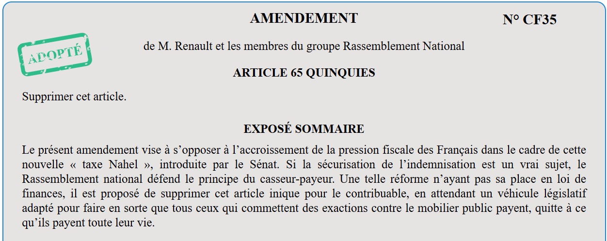 Le RN avait déposé un amendement visant à retirer la « taxe Nahel », introduite par le Sénat pour faire payer aux contribuables les dégradations liées aux émeutes. L’amendement a été adopté, même si un recours au 49.3 est redouté.