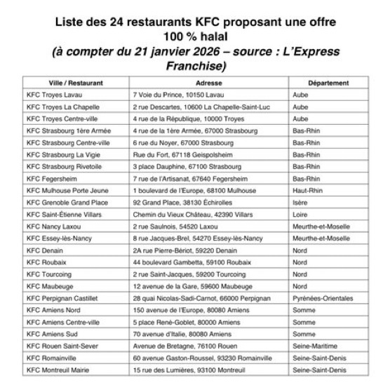 La mise en place de cette offre halal répond, selon KFC France, à une évolution de la demande. «Aujourd’hui, pour accompagner l’évolution du marché et satisfaire une demande croissante d’une partie des consommateurs, nous annonçons que 24 restaurants KFC en France, sur les 404 restaurants, proposeront une offre composée exclusivement de poulet certifié halal, à partir du 21 janvier 2026.» La chaîne précise que les clients pourront identifier précisément les établissements concernés. «La liste exacte des restaurants proposant une offre avec du poulet certifié Halal sera directement disponible sur notre site internet, à partir du 21 janvier dans la section “Trouver un restaurant”.»