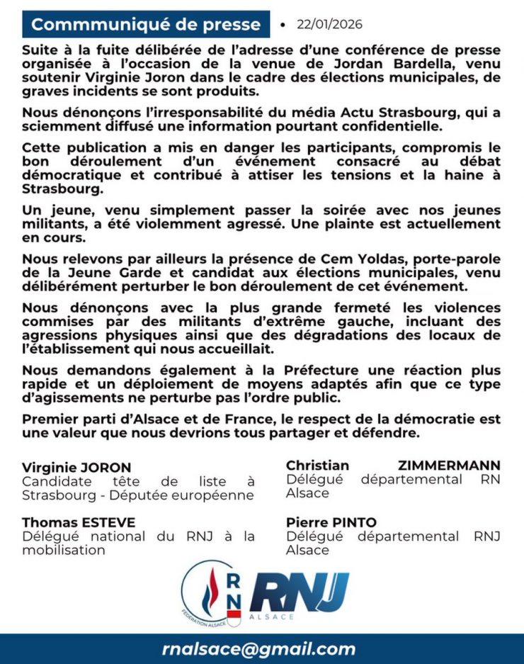 👁️ À #Strasbourg, un jeune militant du RN a été agressé par des militants d'extrême gauche après la diffusion du lieu de la conférence de presse organisée par la candidate aux élections municipales @v_joron et Jordan Bardella.