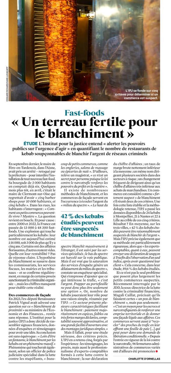 Une étude de l’Institut pour la justice estime que 42 % des kebabs analysés présentent des critères pouvant indiquer un blanchiment d’argent. L’institut s’appuie sur cinq indicateurs financiers et administratifs et appelle à un renforcement des contrôles publics.