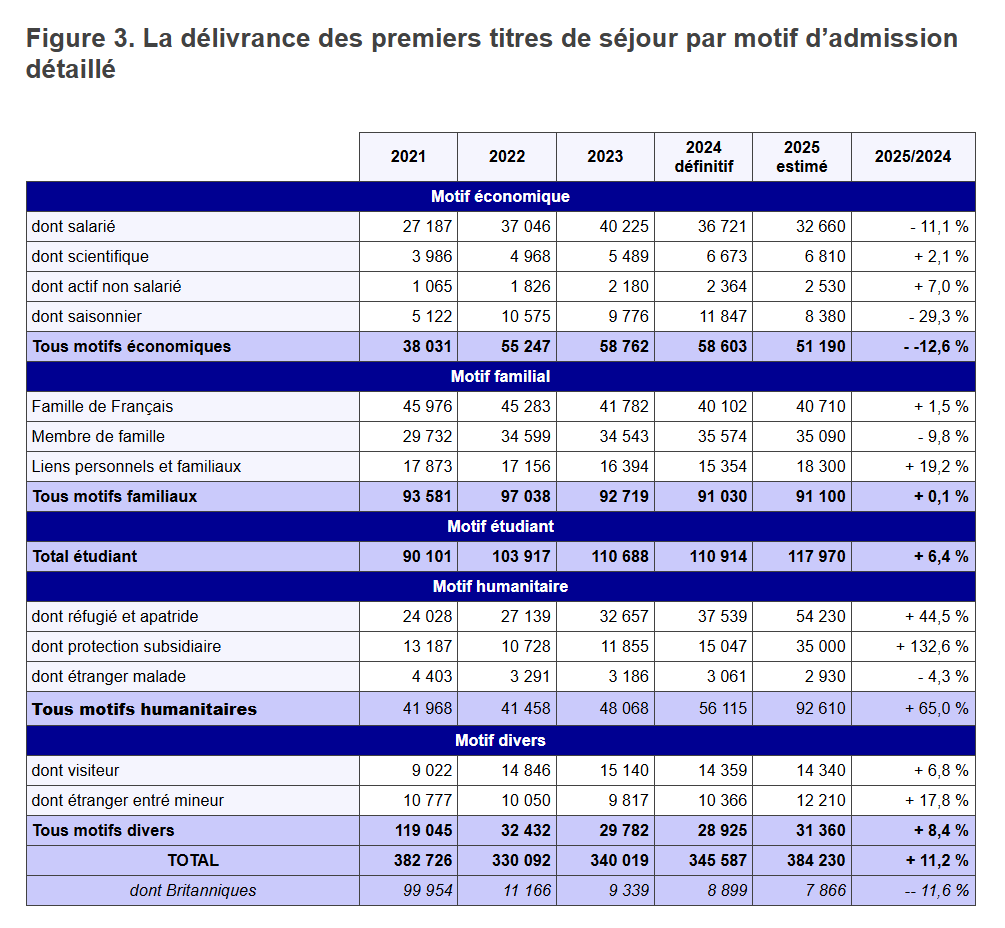 En 2025, le nombre de premiers titres de séjour est de 384 000 soit 39 000 premiers titres en plus sur un an (+ 11,2 %). Cette augmentation est totalement portée par la hausse des premiers titres délivrés pour motif humanitaire (+ 65,0 %) et notamment ceux relatifs à la protection subsidiaire et aux réfugiés et apatrides. Les renouvellements sont également en hausse sur un an (+ 7,6 %), en particulier pour le motif familial (+ 12,0%). La présence étrangère en situation régulière sur le territoire français au 31 décembre 2025 avoisine les 4,5 millions et augmente de 3,2 % sur un an.