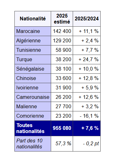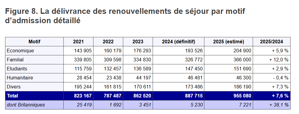 En 2025, 955 000 renouvellements de titres de séjour ont été accordés, soit une hausse de 7,6 % par rapport à 2024, confirmant ainsi la tendance observée ces dernières années, approchant ainsi le million de renouvellements
