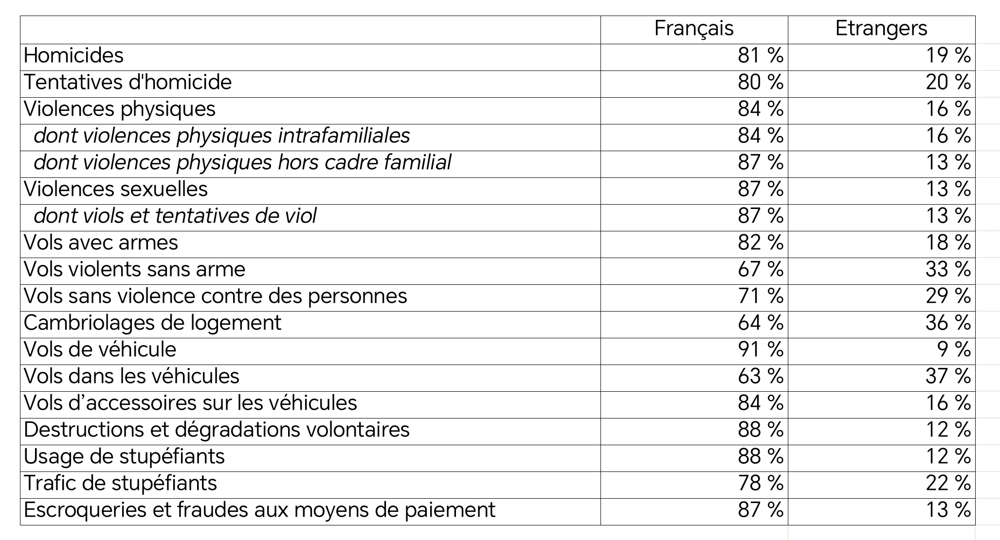 Selon le ministère de l’Intérieur, les étrangers sont surreprésentés, par rapport à leur part dans la population française (8 %), dans l’ensemble des délits et crimes en 2025 (chiffres provisoires)