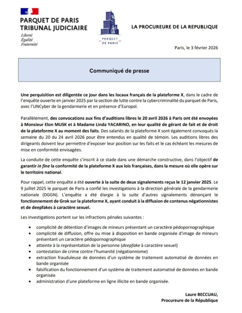 L’enquête a été ouverte à la suite de deux signalements reçus le 12 janvier 2025, puis confiée le 9 juillet 2025 à la direction générale de la gendarmerie nationale. Elle a ensuite été élargie après d’autres signalements visant le fonctionnement de Grok sur la plateforme X, ayant conduit à la diffusion de contenus négationnistes et de deepfakes à caractère sexuel.