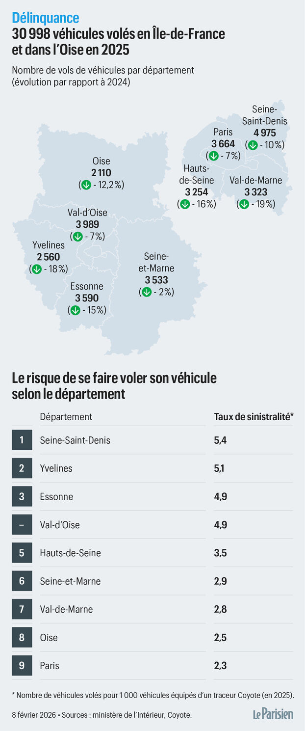 Il existe une compétition officieuse dans laquelle personne n’est parvenu pour le moment à détrôner la France. Notre pays détient toujours le titre peu honorifique de champion d’Europe des vols de voitures. Avec 125 200 véhicules dérobés en 2025 selon les derniers chiffres publiés la semaine passée par le ministère de l’Intérieur, l’Hexagone se distingue encore, en dépit d’une baisse de 9 % l’an passé par rapport à 2024. Un chiffre ramené à 121 728 pour la seule France métropolitaine.
