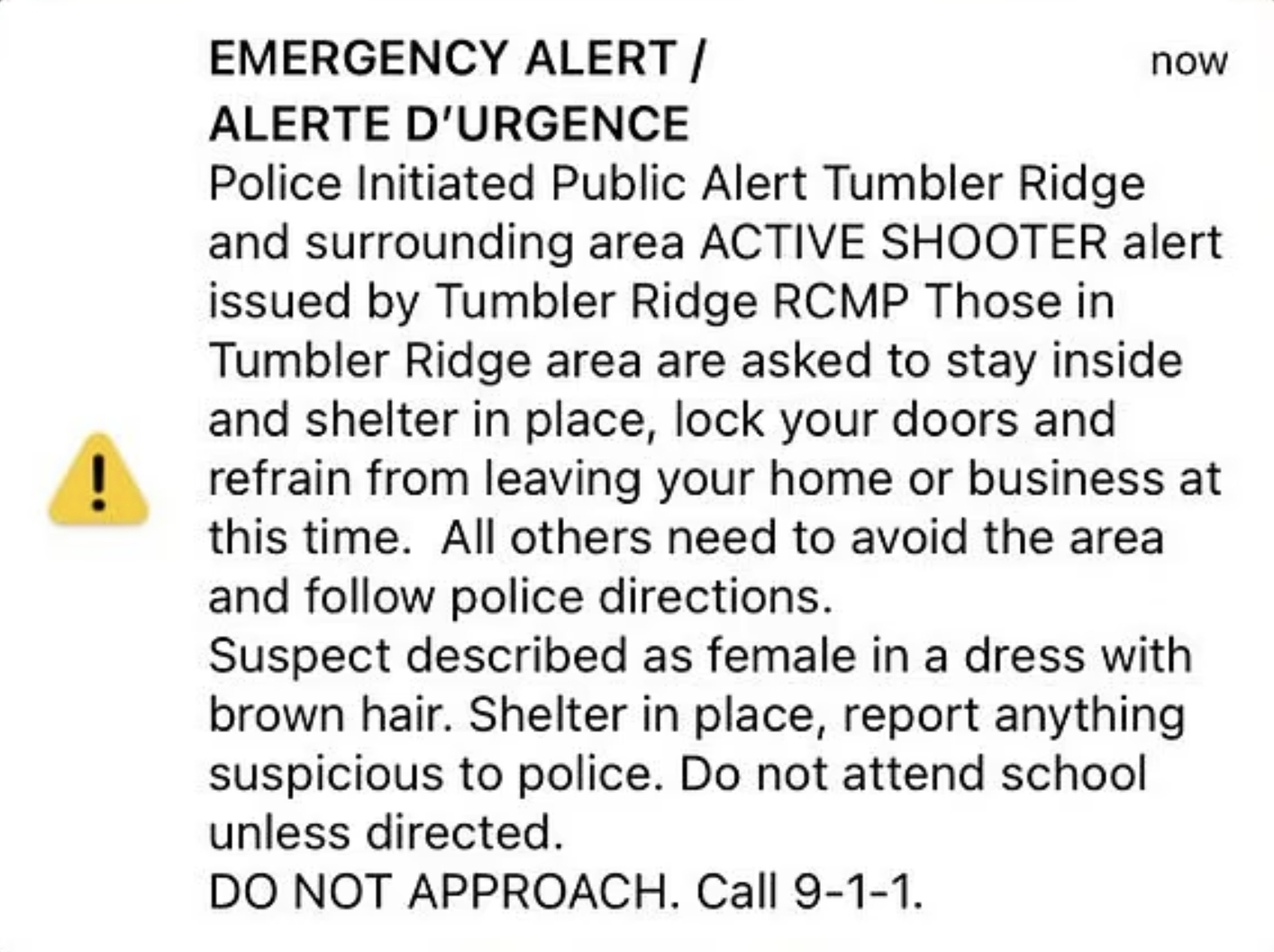 Les autorités affirment connaître l’identité de l’agresseur, mais n’ont pas révélé son nom ni son sexe . Auparavant, une alerte de confinement décrivait le suspect comme une « femme en robe aux cheveux bruns » :