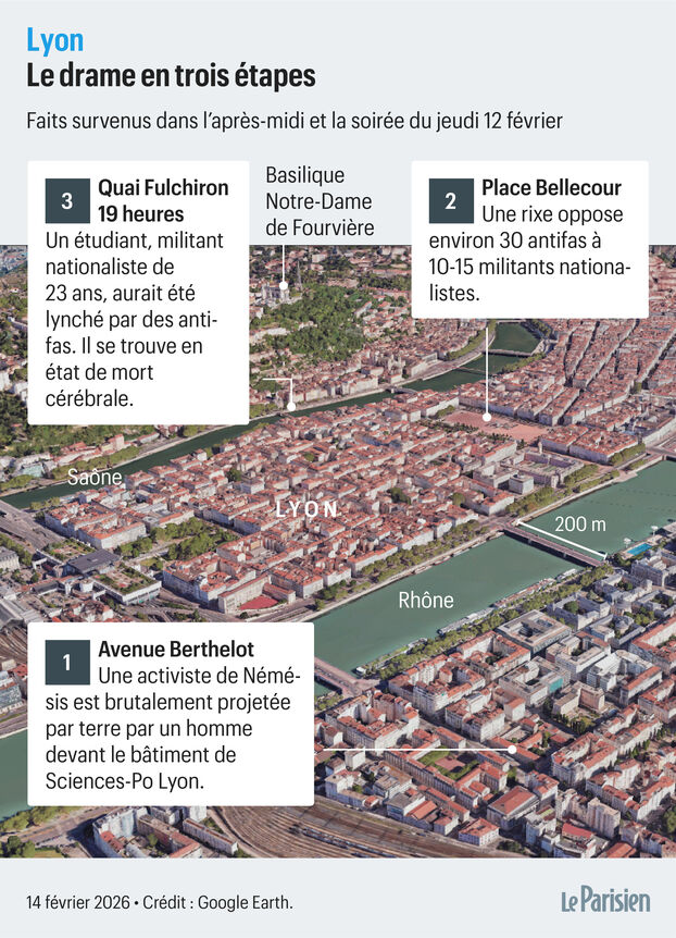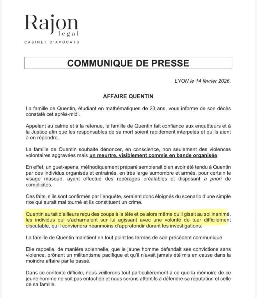 Si une enquête pour «violences aggravées» a immédiatement été ouverte par le parquet de Lyon et permettra d’éclaircir davantage les faits, le collectif féministe et identitaire Némésis a vite précisé sa version de la soirée : Quentin avait été sollicité, en compagnie d’une quinzaine d’autres militants, pour assurer un service d’ordre informel à proximité de l’IEP de Lyon où l’eurodéputée LFI Rima Hassan donnait une conférence, à laquelle Némésis s’est opposée en déployant une banderole. Plusieurs dizaines de militants antifas ont alors pris à partie violemment les jeunes filles, puis ont poursuivi les militants nationalistes postés non loin, jusqu’à rattraper Quentin et son camarade et les rouer de coups.