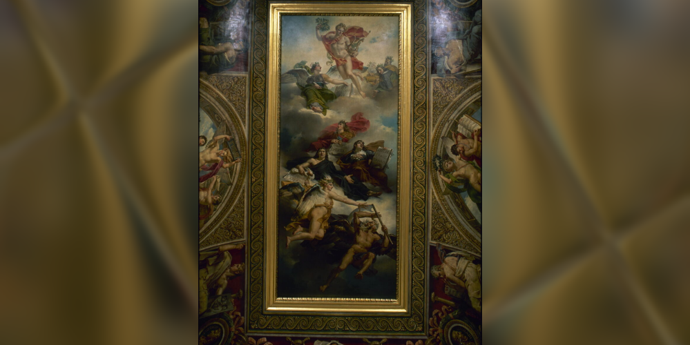 L’œuvre en question est un plafond peint par Charles Meynier, datant de 1820, intitulé Le triomphe de la peinture française, apothéose de Poussin, de Le Sueur et de Le Brun (…)