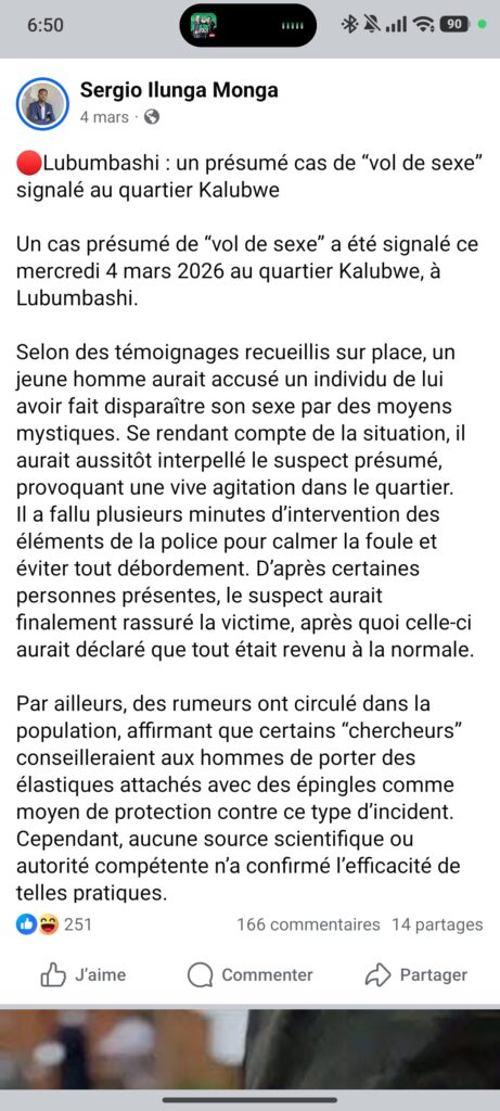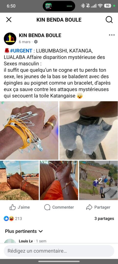 En République démocratique du Congo (RDC), dans la région du Katanga, des rumeurs circulent depuis une quinzaine de jours autour de la disparition mystérieuse des organes génitaux chez les hommes, par un simple contact physique. Des théories qui sont amplifiées par la caisse de résonance des réseaux sociaux, si bien qu’une dizaine de personnes accusées d’être responsables de ces disparitions ont été prises à partie. Il y a au moins quatre morts. La police menace d’arrêter toute personne qui se livrerait à ces actes.