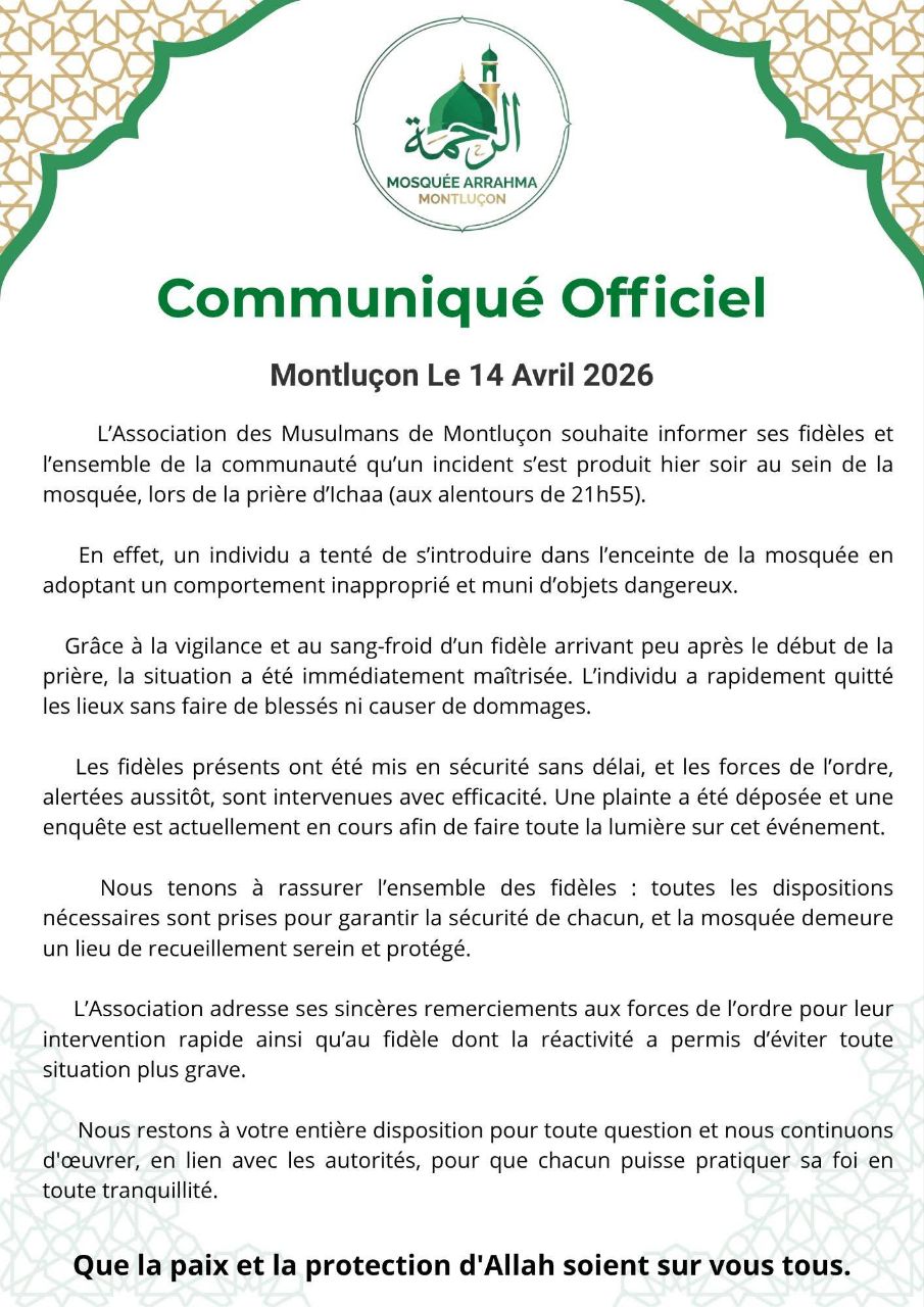 Un fidèle de la mosquée Ar Rahma de Montluçon, dans l’Allier, a été menacé par un individu armé d’un couteau et d’un hachoir ce lundi soir vers 22 heures. Le fidèle, qui était en retard pour la prière, arrive devant le lieu de culte et croise un homme au comportement suspect, qui portait un extincteur. Le fidèle l’interroge brièvement pour lui demander ce qu’il fait avec un extincteur devant la mosquée. L’individu se rapproche alors du fidèle et le menace, avec un couteau dans une main et un hachoir dans l’autre. Pris de panique, le fidèle se réfugie rapidement dans la mosquée avant d’appeler le 17. D’après les premiers éléments, aucune allusion à l’islam n’a été évoquée lors de l’agression.