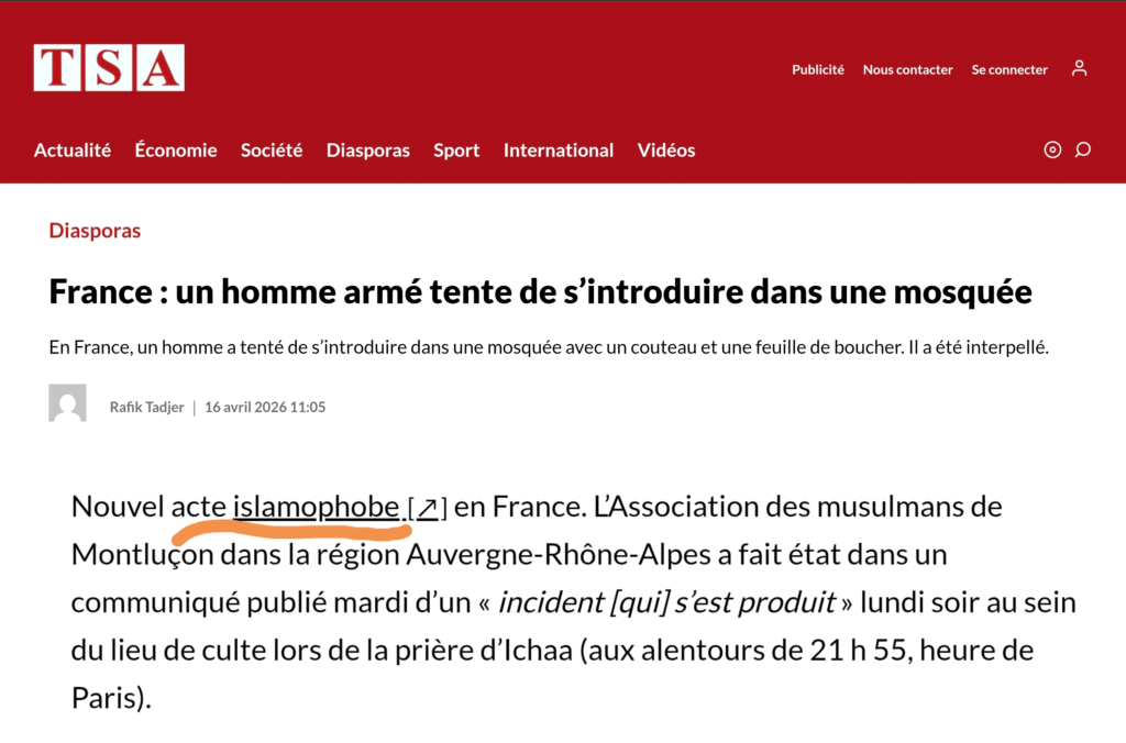 Alors que le média algérien TSA passe sous silence les attentats en Algérie, il évoque en revanche un prétendu acte islamophobe dans une mosquée en France. Or, la mosquée concernée n’a fait état d’aucun propos islamophobe de la part de l’individu, et le parquet, qui a rapidement communiqué, a écarté la qualification d’acte islamophobe.