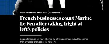 Société Les chefs d’entreprise français s’empressent de nouer des contacts avec le RN effrayés par le programme du #nouveaufrontpopulaire révèle le Financial Times