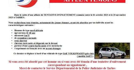 Sécurité Tentative d’enlèvement à Tarbes (65) : la police lance un appel à témoins pour retrouver des victimes Sécurité Tentative d’enlèvement à Tarbes (65) : la police lance un appel à témoins pour retrouver des victimes