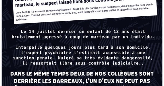 Sécurité Caen (14) : Un enfant de 12 ans frappé à coups de marteau : l’agresseur remis en liberté et placé sous contrôle judiciaire (MàJ : Alliance dénonce le 2 poids, 2 mesures avec le policier incarcéré) Sécurité Caen (14) : Un enfant de 12 ans frappé à coups de marteau : l’agresseur remis en liberté et placé sous contrôle judiciaire (MàJ : Alliance dénonce le 2 poids, 2 mesures avec le policier incarcéré)