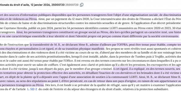 La Cour nationale du droit d’asile (CNDA) a jugé que les personnes transgenres originaires du Pérou constituent un « groupe social » au sens de la Convention de Genève, ouvrant droit à une protection internationale. La...