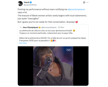 CultureSport « Un effacement des artistes noires » : alors que le compte X des JO met en avant la performance d’Yseult lors la clôture des Jeux olympiques d’été de 2024, l’artiste déplore que son nom ne soit pas mentionné CultureSport « Un effacement des artistes noires » : alors que le compte X des JO met en avant la performance d’Yseult lors la clôture des Jeux olympiques d’été de 2024, l’artiste déplore que son nom ne soit pas mentionné