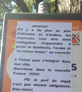 Société Chartres (28). La police scientifique saisie après la découverte d’une affiche à caractère raciste placardée sur un arrêt de bus Société Chartres (28). La police scientifique saisie après la découverte d’une affiche à caractère raciste placardée sur un arrêt de bus