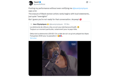 CultureSport « Un effacement des artistes noires » : alors que le compte X des JO met en avant la performance d’Yseult lors la clôture des Jeux olympiques d’été de 2024, l’artiste déplore que son nom ne soit pas mentionné CultureSport « Un effacement des artistes noires » : alors que le compte X des JO met en avant la performance d’Yseult lors la clôture des Jeux olympiques d’été de 2024, l’artiste déplore que son nom ne soit pas mentionné