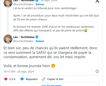 SécuritéTech “Ils doivent me reverser 250€ chacun et me rembourser seulement 50% des affaires qui manquent, et pas de peine de prison” : le youtubeur Léo TechMaker pousse un coup de gueule contre le laxisme dont bénéficient ses cambrioleurs SécuritéTech “Ils doivent me reverser 250€ chacun et me rembourser seulement 50% des affaires qui manquent, et pas de peine de prison” : le youtubeur Léo TechMaker pousse un coup de gueule contre le laxisme dont bénéficient ses cambrioleurs