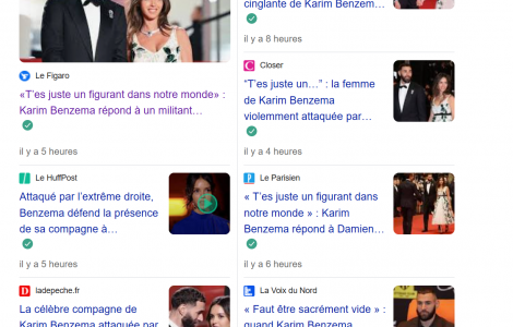SociétéSportTech Clash Rieu-Benzema : l’ensemble de la presse se range du côté de Benzema, comme si le fait que l’épouse d’un compagnon de route de l’islamisme participe à l’hommage aux victimes du 13-Novembre ne soulevait aucune interrogation (MàJ) SociétéSportTech Clash Rieu-Benzema : l’ensemble de la presse se range du côté de Benzema, comme si le fait que l’épouse d’un compagnon de route de l’islamisme participe à l’hommage aux victimes du 13-Novembre ne soulevait aucune interrogation (MàJ)