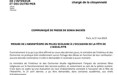 PolitiqueSociété Évaluation du taux d’absentéisme pendant le l’Aïd-al-Fitr : l’Intérieur dément un fichage ; « aucune donnée nominative n’a été ni demandée ni recensée à aucun moment » PolitiqueSociété Évaluation du taux d’absentéisme pendant le l’Aïd-al-Fitr : l’Intérieur dément un fichage ; « aucune donnée nominative n’a été ni demandée ni recensée à aucun moment »