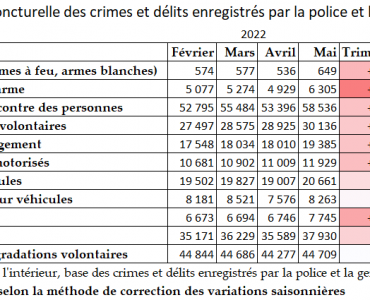 Sécurité France : “La quasi-totalité des indicateurs conjoncturels des crimes et délits enregistrent de nettes hausses en mai 2022” (ministère de l’intérieur) Sécurité France : “La quasi-totalité des indicateurs conjoncturels des crimes et délits enregistrent de nettes hausses en mai 2022” (ministère de l’intérieur)