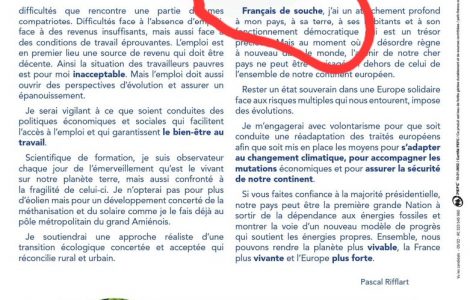 Politique P. Rifflart, candidat macroniste dans la Somme face à F. Ruffin, se revendique “Français de souche” dans sa plaquette de campagne (MàJ : après l’avoir “assumé”, il remplace le terme par “comme tout Français”, à la demande de Renaissance) Politique P. Rifflart, candidat macroniste dans la Somme face à F. Ruffin, se revendique “Français de souche” dans sa plaquette de campagne (MàJ : après l’avoir “assumé”, il remplace le terme par “comme tout Français”, à la demande de Renaissance)